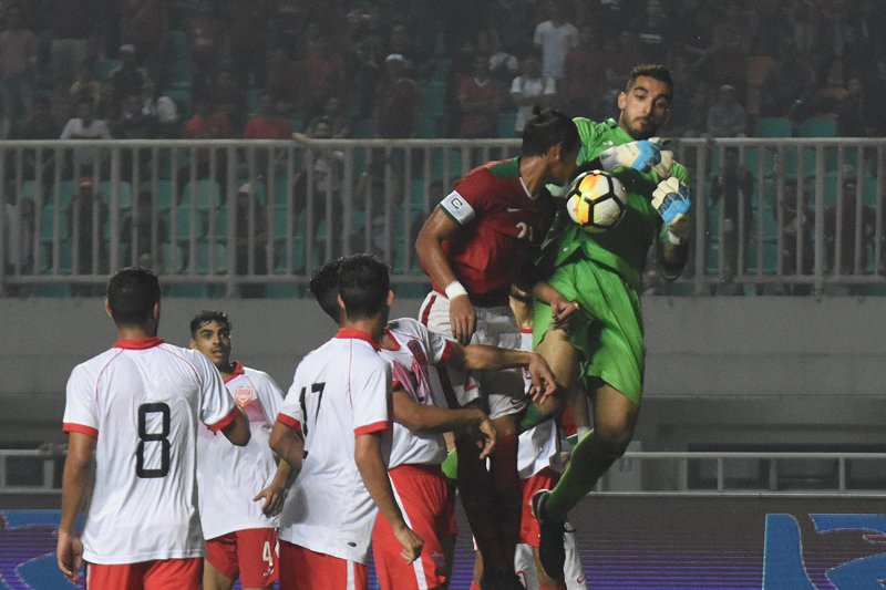 Pesepak bola timnas U-23 Indonesia Hansamu Yama (kedua kanan) berebut bola dengan penjaga gawang timnas U-23 Bahrain Yusuf Shabaan (kanan) pada PSSI Anniversary Cup 2018 di Stadion Pakansari, Bogor, Jawa Barat, Jumat (27/4/2018). Timnas U-23 Indonesia kalah atas timnas U-23 Bahrain dengan skor 0-1. (ANTARA FOTO/Indrianto Eko Suwarso)